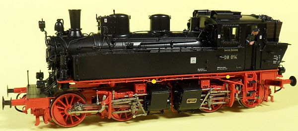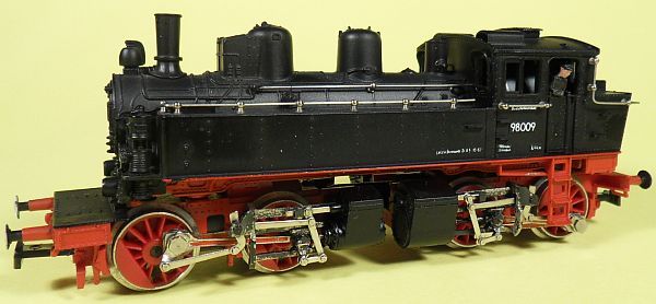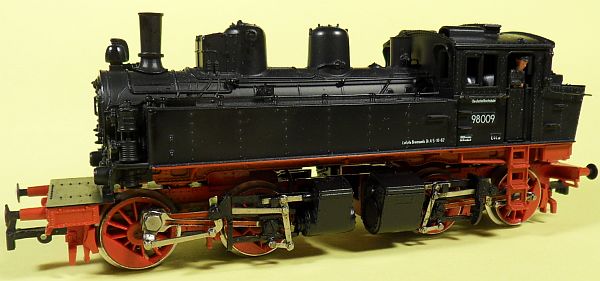 Fahrzeugtyp: Dampflok Baureihe 98 - Kreuzspinne Fahrzeugnummer: 98.009 Bahnverwaltung: DR Epoche: III Länge über Puffer: 142 mm Hersteller: Rivarossi Artikelnummer: 1340, 1. Bauserie. Zusatz: Mit Personal ausgerüstet. Größe: Nenngröße H0, Maßstab 1:87, Spurweite 16,5 mm 03.05.2013 |