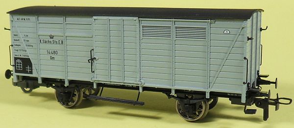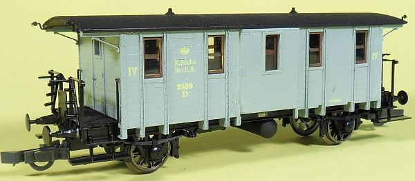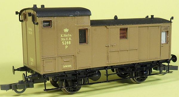 Fahrzeugtyp: Packwagen Fahrzeugnummer: 5288 Bahnverwaltung: K.Sächs.Sts.E.B. Epoche: I Länge über Puffer: 96 mm Hersteller: ehemals Sachsenmodelle Artikelnummer: ehemals 14204 Zusatz: Umbau aus Originalfahrzeug siehe hier. Größe: Nenngröße H0, Maßstab 1:87, Spurweite 16,5 mm 21.03.2015 |