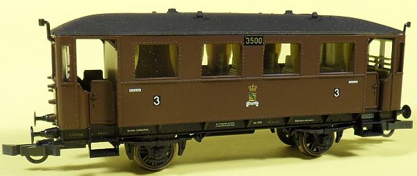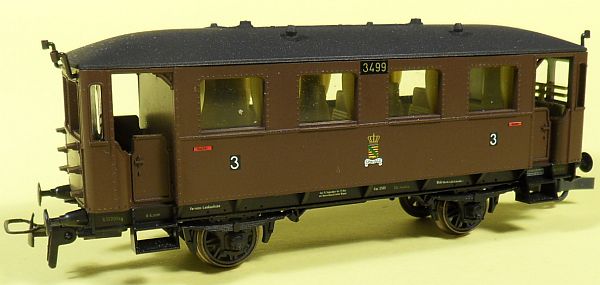 Fahrzeugtyp: Windberg-Aussichtswagen Fahrzeugnummer: 3500 Bahnverwaltung: K.Sächs.Sts.E.B. Epoche: I Länge über Puffer: 117 mm Hersteller: Piko Artikelnummer: 53067 Zusatz: 3.Klasse. 27.03.2013 |