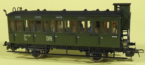 Fahrzeugtyp: Abteilwagen CSa95 mit Bremserhaus Fahrzeugnummer: 530-213 Bahnverwaltung: DR Epoche: III Länge über Puffer: 110 mm Hersteller: Piko Artikelnummer: 5/6516/010 Zusatz: 2.Klasse, mit Inneneinrichtung und Fahrgästen ausgerüstet. Größe: Nenngröße H0, Maßstab 1:87, Spurweite 16,5 mm 22.04.2013 |