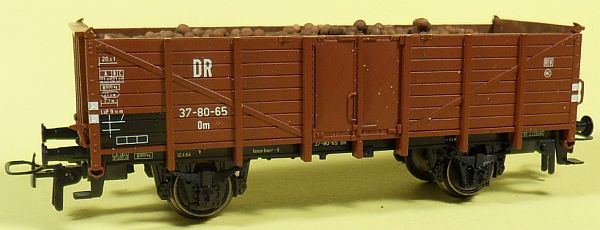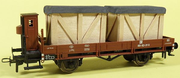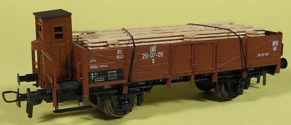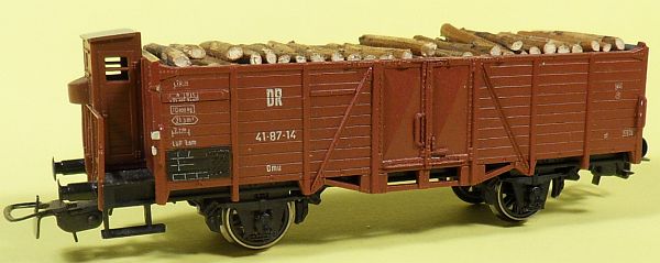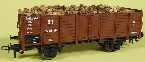 Fahrzeugtyp: Offener Güterwagen Fahrzeugnummer: 35-01-10 Bahnverwaltung: DR Epoche: III Länge über Puffer: 105 mm Hersteller: Piko Artikelnummer: 5413? Zusatz: Mit Holzscheiten beladen. Größe: Nenngröße H0, Maßstab 1:87, Spurweite 16,5 mm 29.10.2013 |