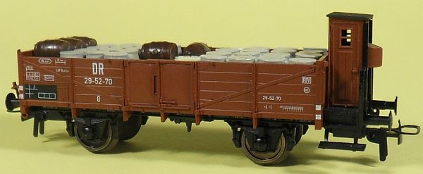 Fahrzeugtyp: Offener Güterwagen - Bauart Halle Fahrzeugnummer: 29-52-70 Bahnverwaltung: DR Epoche: III Länge über Puffer: 101 mm Hersteller: Fleischmann Artikelnummer: 5709 Zusatz: Mit Bremserhaus. Mit Fässern und Tonnen beladen. Größe: Nenngröße H0, Maßstab 1:87, Spurweite 16,5 mm 22.04.2013 |