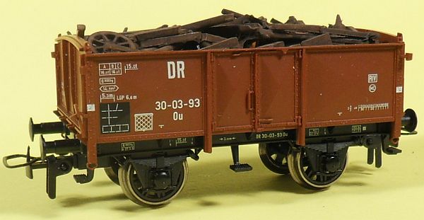 Fahrzeugtyp: Offener Güterwagen Fahrzeugnummer: 30-03-93 Bahnverwaltung: DR Epoche: III Länge über Puffer: 76 mm Hersteller: Fleischmann Artikelnummer: 5711 Zusatz: Mit Schrott beladen. Größe: Nenngröße H0, Maßstab 1:87, Spurweite 16,5 mm 27.03.2013 |