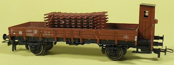 Fahrzeugtyp: Niederbordwagen Fahrzeugnummer: 20 50 323 5029-9 Bahnverwaltung: DR Epoche: Epoche: IV, Umbeschriftung zu Epoche III ist geplant. Länge über Puffer: 112 mm Hersteller: Weigel Artikelnummer: 1100 Zusatz: Mit Bremserhaus. Mit Stahlgittern beladen. Größe: Nenngröße H0, Maßstab 1:87, Spurweite 16,5 mm 22.04.2013 |
