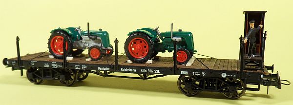Fahrzeugtyp: Flachwagen Fahrzeugnummer: 916 Bahnverwaltung: DRG Epoche: II Länge über Puffer: 152 mm Hersteller: Fleischmann Artikelnummer: 5285 Zusatz: Mit Bremserhaus. Mit Traktoren beladen. Größe: Nenngröße H0, Maßstab 1:87, Spurweite 16,5 mm 27.03.2013 |