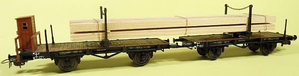 Fahrzeugtyp: Drehschemelwagen Fahrzeugnummer: 68-45-67 und 68-19-24 Bahnverwaltung: DR Epoche: III Länge über Puffer: 114 und 106 mm Hersteller: Piko Artikelnummer: ehemals 5/6409/010 Zusatz: Nachträglich beschriftet und einen Wagen mit Bremserhaus ausgestattet. Mit Holzbalken beladen. Größe: Nenngröße H0, Maßstab 1:87, Spurweite 16,5 mm 27.03.2013 |