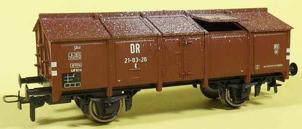 Fahrzeugtyp: Klappdeckelwagen Fahrzeugnummer: 21-83-26 Bahnverwaltung: DR Epoche: III Länge über Puffer: 98 mm Hersteller: Roco Artikelnummer: 46754 Zusatz: --- Größe: Nenngröße H0, Maßstab 1:87, Spurweite 16,5 mm 27.03.2013 |