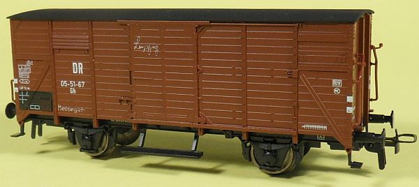 Fahrzeugtyp: Flachdachwagen Fahrzeugnummer: 05-51-67 Bahnverwaltung: DR Epoche: III Länge über Puffer: 103 mm Hersteller: Roco Artikelnummer: 46821 Zusatz: Mit Kreidebeschriftung "Messegut Leipzig". Größe: Nenngröße H0, Maßstab 1:87, Spurweite 16,5 mm 22.04.2013 |