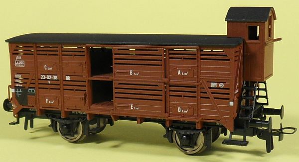 Fahrzeugtyp: Flachdach-Verschlagwagen Fahrzeugnummer: 23-02-38 Bahnverwaltung: DR Epoche: III Länge über Puffer: 101 mm Hersteller: Fleischmann Artikelnummer: 5764 Zusatz: Mit Bremserhaus. Größe: Nenngröße H0, Maßstab 1:87, Spurweite 16,5 mm 22.04.2013 |