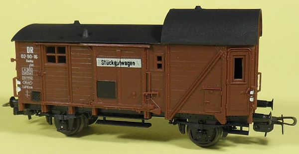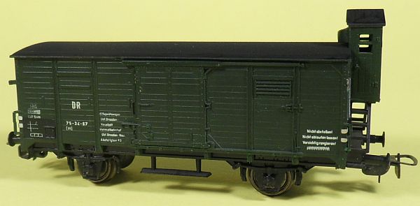 Fahrzeugtyp: Packwagen Fahrzeugnummer: 88-80-67 Bahnverwaltung: DR Epoche: III Länge über Puffer: 97 mm Hersteller: Weinert Artikelnummer: 4143 Zusatz: Bausatz lackiert und beschriftet. Größe: Nenngröße H0, Maßstab 1:87, Spurweite 16,5 mm 22.04.2013 |