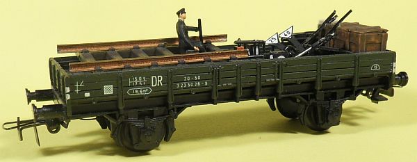 Fahrzeugtyp: Niederbordwagen Fahrzeugnummer: 20 50 323 5028 9 Bahnverwaltung: DR Epoche: IV, Umbeschriftung zu Epoche III ist geplant. Länge über Puffer: 104 mm Hersteller: Weigel Artikelnummer: 1102 Zusatz: Mit Bahnbaumaterial beladen. Größe: Nenngröße H0, Maßstab 1:87, Spurweite 16,5 mm 27.03.2013 |