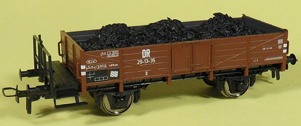 Fahrzeugtyp: Offener Güterwagen - Bauart Halle Fahrzeugnummer: 29-13-35 Bahnverwaltung: DR Epoche: III Länge über Puffer: 102 mm Hersteller: Tillig Artikelnummer: 76567 Zusatz: Mit Bremserbühne und mit Kohle beladen. Größe: Nenngröße H0, Maßstab 1:87, Spurweite 16,5 mm 28.03.2014 |