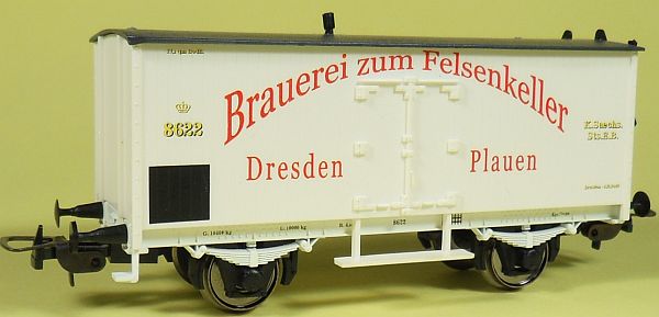 Fahrzeugtyp: Bierwagen Fahrzeugnummer: 3622 Bahnverwaltung: K.Sächs.Sts.E.B. Epoche: I Länge über Puffer: 96 mm Hersteller: Tillig Artikelnummer: 76397 Zusatz: Brauerei zum Felsenkeller Dresden Plauen Größe: Nenngröße H0, Maßstab 1:87, Spurweite 16,5 mm 16.06.2015 |